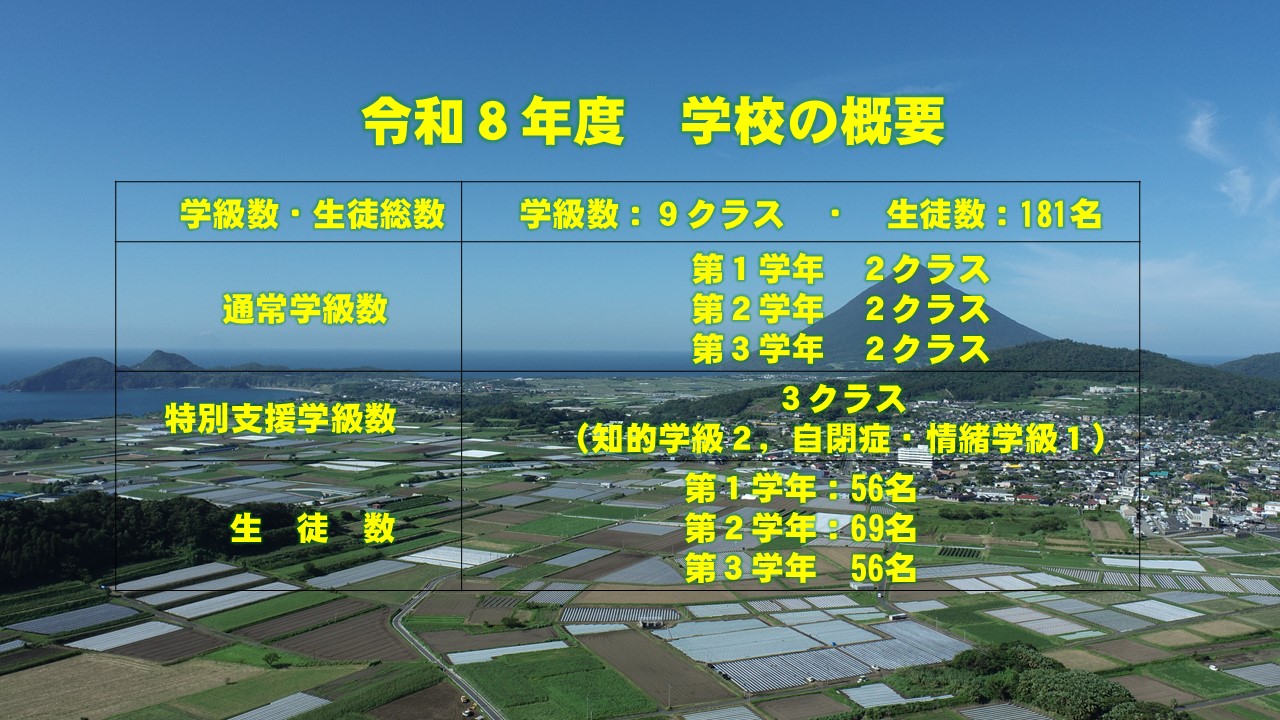 昭和50年5月24日に校章を制定しました。白く輝く「中」の字の下に,別名「鶴の港」と呼ばれる郷土山川港にちなんで羽を広げた鶴をいぶし銀でかたどってあります。鶴は気品と英知と勇気を象徴し豊かに広げた羽は,果てしない大空をおおらかに飛翔する鶴にあやかって,どこまでも発展していく山川中学校の将来を希望したものです。